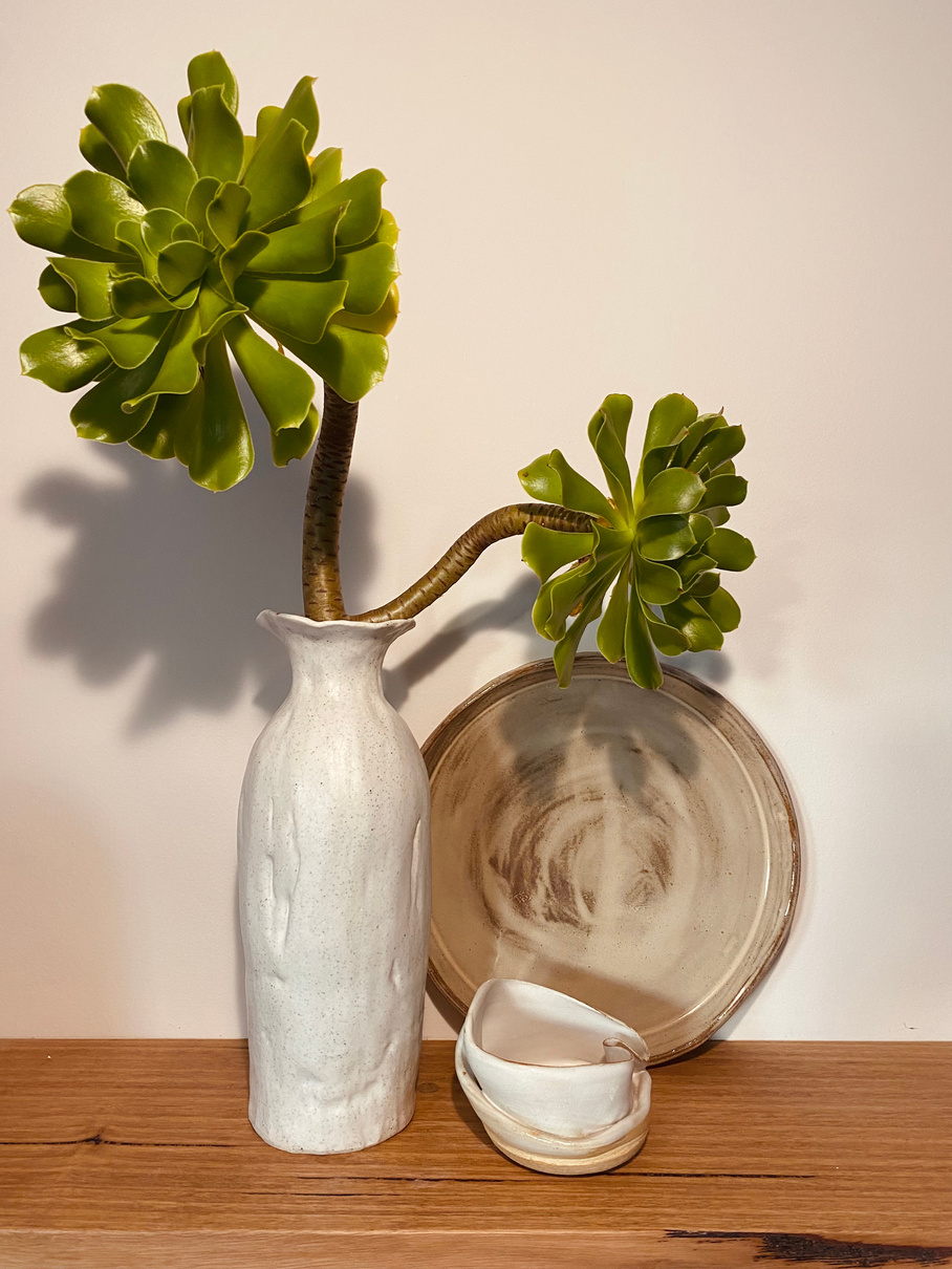 These expressions are as pure as a simple thought, a momentary curiosity, a distant memory or place. I translate these thoughts into the clay, taking care to shape each piece by hand with patience and dedication. The handmade nature of the pieces hold imperfections born from the making process and I seek to capture those moments in the clay rather than cover them up. Thumb marks in shaping a surface, a wobble or bump indenting the soft clay at the moment the piece is lifted off the wheel and placed on a shelf to dry.
